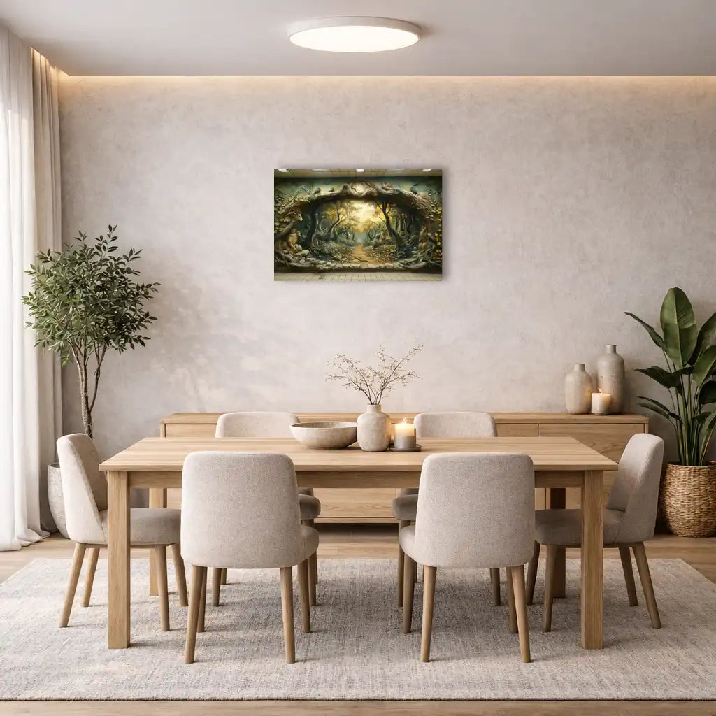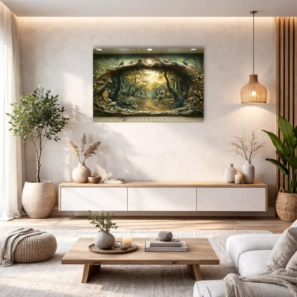 Découvrez l'impression sur toile qui transforme votre espace en une caverne d'art moderne et mystérieux. Notre tableau déco intitulé "Échappée Mystique en Forêt" capture la quintessence du street art avec une touche zen et abstraite, parfaite pour votre décoration intérieure.
