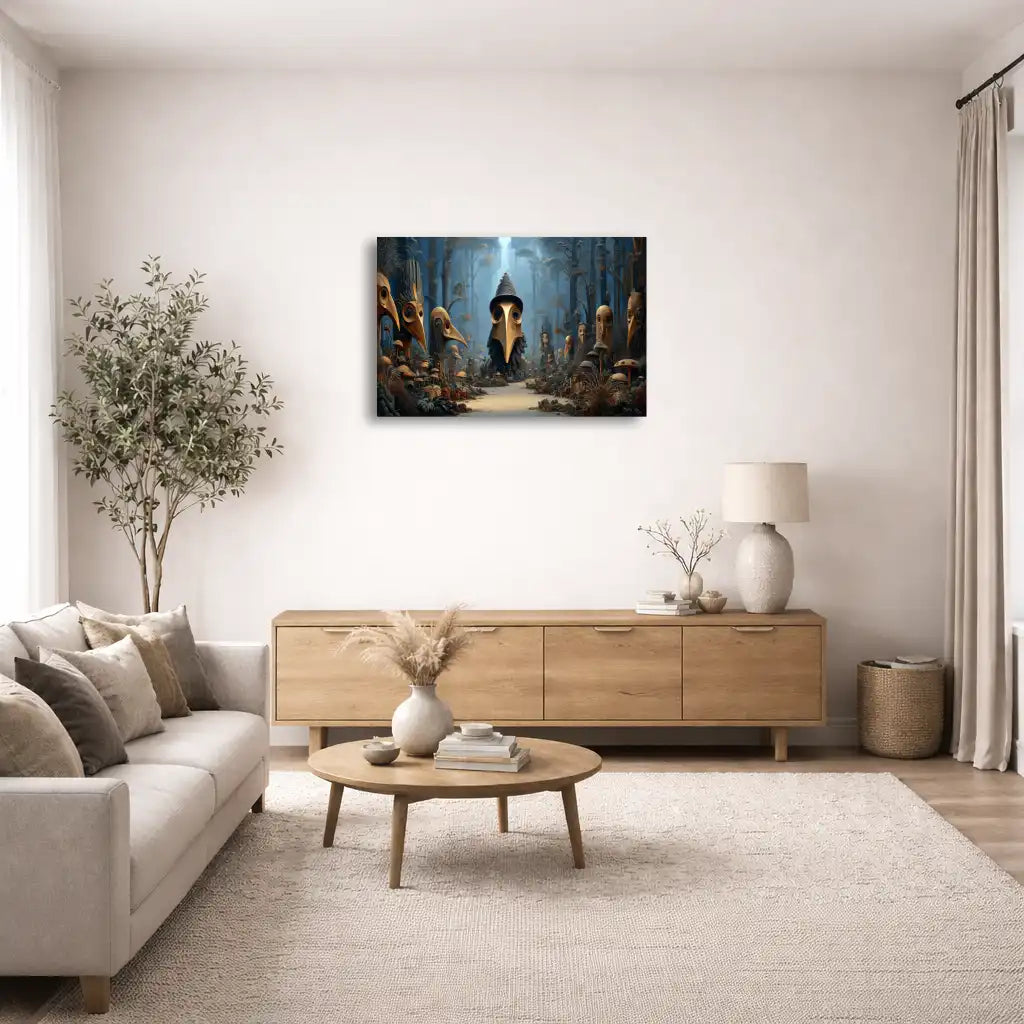 Avec la Toile surréaliste Le Conseil des Masques aux becs d oiseaux, vous entrez dans une forêt bleutée où chaque arbre semble abriter un esprit. Au centre du chemin, une grande silhouette coiffée d’un chapeau conique vous fixe de ses grands yeux ronds, entourée d’une assemblée de masques aux longs becs d’oiseaux. Entre fougères, herbes hautes et champignons étranges, ce paysage onirique donne l’impression d’assister à un rituel secret, figé dans un silence presque sacré.